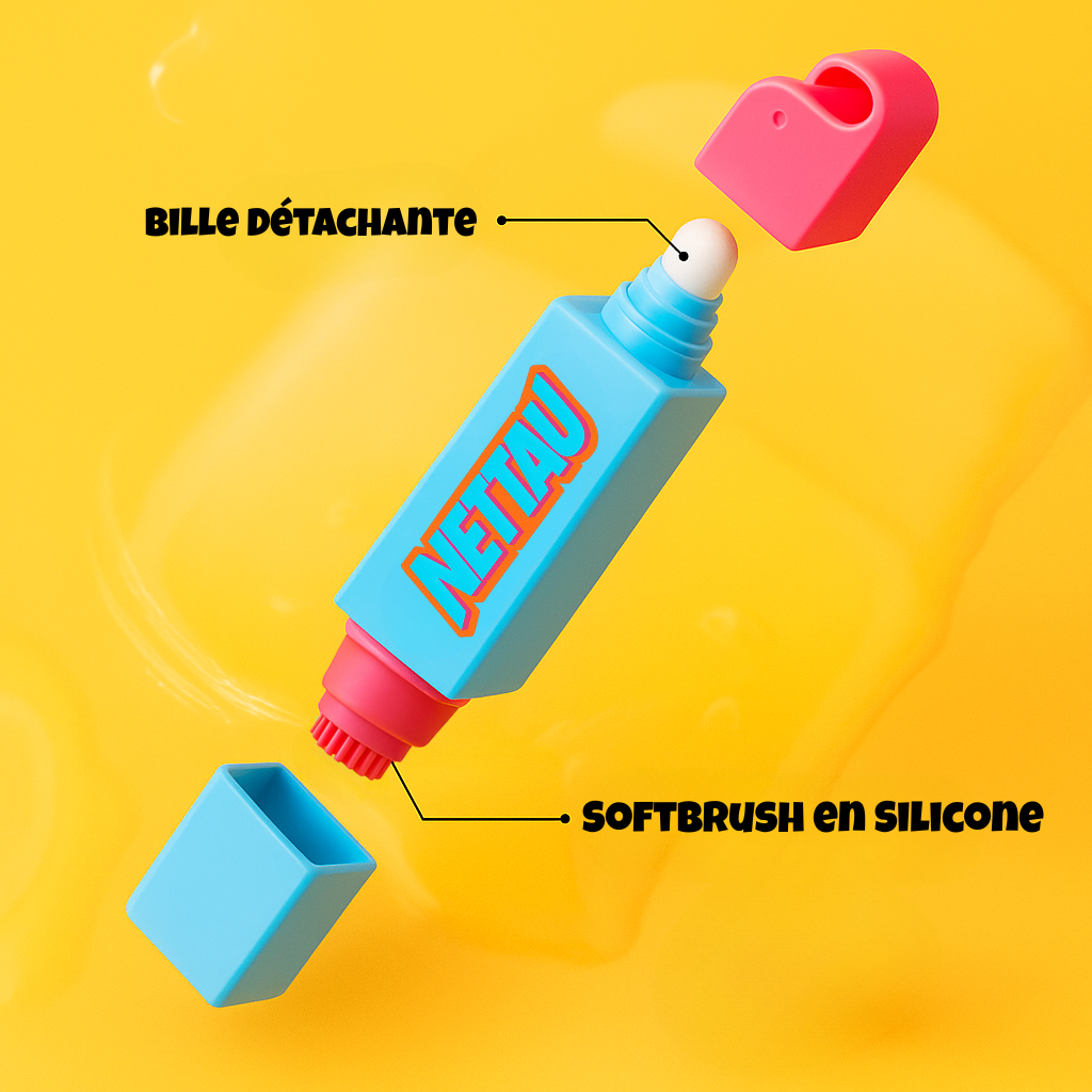 Utilise la bille de ton Nettau pour gommer la surface de ton tâche, notre liquide effacera ta tâche selon ton tissu et ta salissure, pour un meilleur détachement, gomme pendant 30 à 40 secondes.